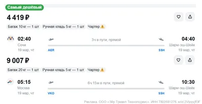 В Шарм-эш-Шейх из разных городов в марте — от 4,4 тыс. руб. OW (разные авиакомпании, прямой рейс, с багажом) 📌 Из Сочи 19 марта — за 4,4 тыс. руб. 📌 Из Перми 28 марта — за 4,6 тыс. руб. 📌 Из Сам