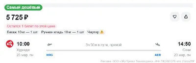 Хургада - Сочи с вылетом 23 марта — за 5,7 тыс. руб. в одну сторону (Уральские авиалинии, прямой рейс, багаж включен) → https://100500miles.ru/f/HRG2303AER1 👉 Источник: Чартер Горит!
