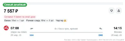 Шарм-эш-Шейх - Москва с вылетом 28 марта — за 7,6 тыс. руб. OW (Уральские авиалинии, прямой рейс, багаж включен) → https://100500miles.ru/f/SSH2803MOW1 👉 Источник: Чартер Горит!