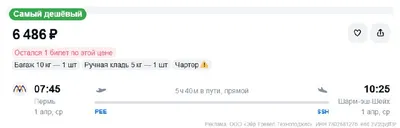 🇪🇬 Пермь - Шарм-эш-Шейх с вылетом 1 апреля — за 6,5 тыс. руб. в одну сторону (Almasria Universal Airlines, прямой рейс, багаж включен) → https://100500miles.ru/f/PEE0104SSH1 👉 Источник: Чартер Го