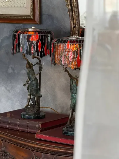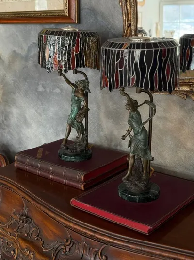 В НАЛИЧИИ❗️ Произведение искусства в стиле Ар - Нуво 💎💎 Пара шикарных настольных ламп Бронзовая скульптура девушки с корзиной цветов на мраморной подставке. Плафон выполнен в технике витражного