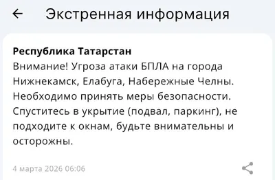 ⚡️ Объявлена угроза атаки БПЛА на Елабугу, Нижнекамск и Набережные Челны Жителям рекомендовано проследовать в укрытия.