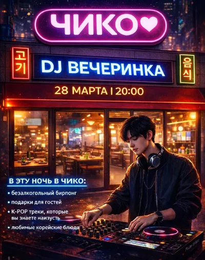 🌸Встречаем весну громко - DJ вечеринкой в ЧИКО! Скоро начинаются каникулы, а значит самое время собраться, включить любимый K-POP и провести вечер в классной компании 💜 28 марта в 20:00 📍Советски