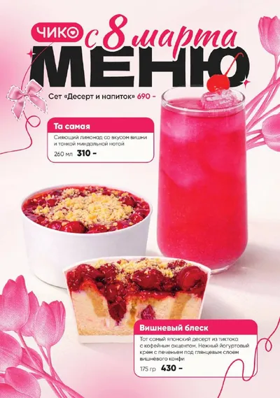 Встречаем 8 марта с особым меню 🌸 С 8 по 19 марта в Чико будет царить вишнёвое настроение - новые десерты, напитки и праздничная атмосфера 🍒 Заглядывайте за вкусом и весенним настроением! Ставьте