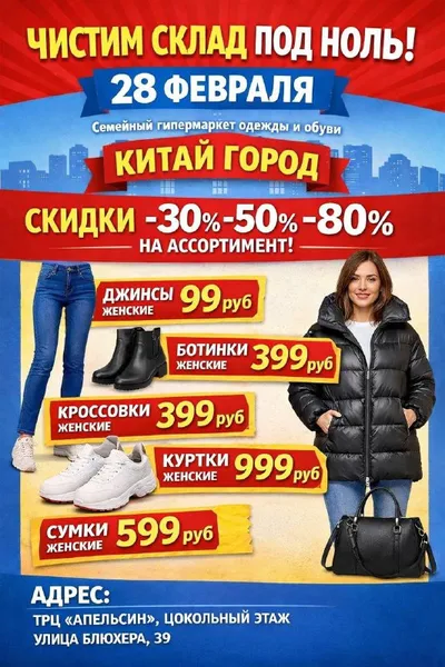 😱ЧИСТИМ СКЛАД ПОД НОЛЬ😱 Для очень экономных покупателей с 28 февраля семейный гипермаркет одежды и обуви «Китай Город» проводит распродажу со скидками -30%, -50%, -80%. Ищите скидки на каждой пол