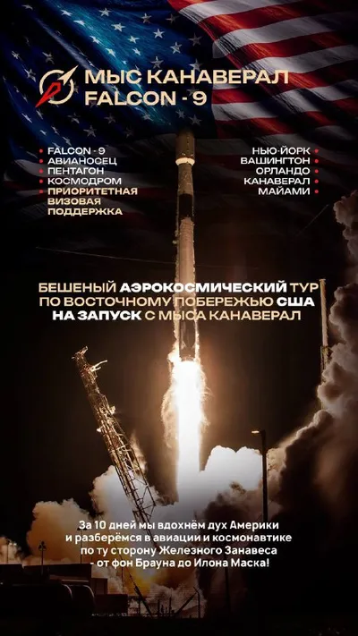 Falcon Route 🇺🇸 Аэрокосмический пусковой тур на мыс Канаверал, США Америка — это не точка на карте, это состояние драйва. Время ловить рокот космодрома и впитывать ритм мегаполисов, которые никогд