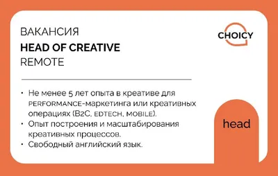 Head of Creative #remote Международная онлайн-школа программирования для детей и подростков. 👉 Узнать подробнее и откликнуться Подпишись 🔸 @choicy_work