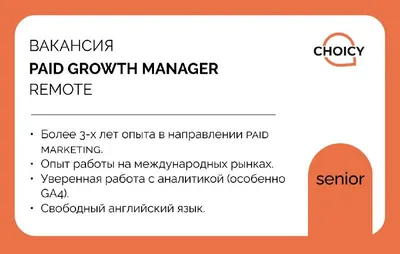 Paid Growth manager #remote Международная travel-tech компания и партнерская платформа. 👉 Узнать подробнее и откликнуться Подпишись 🔸 @choicy_work
