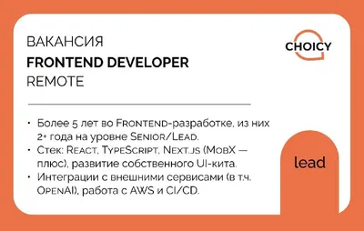 Frontend developer #remote Международный стартап в сфере профессионального нетворкинга. 👉 Узнать подробнее и откликнуться Подпишись 🔸 @choicy_work