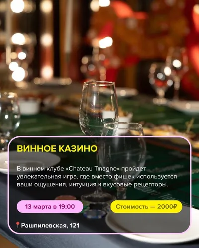 Ваш гид по мероприятиям на этих выходных💛 📌Организаторы: ▫️ВИННОЕ КАЗИНО * ▫️ПЯТНИЧНАЯ ВЕЧЕРИНКА * ▫️ИГРА В МАФИЮ ▫️КОНЦЕРТ АВТОРСКОЙ МУЗЫКИ ▫️КОНЦЕРТ ИГНАТИЯ ВИНТУРОВА ▫️КАППИНГ ▫️ЛЕКТОРИЙ