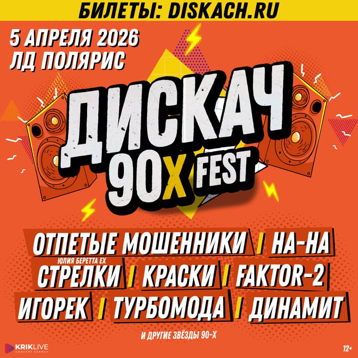 🥳 СОВСЕМ СКОРО! 🥳 🎉 Фестиваль "Дискач 90-х" открывает свои двери во Владимире! 🎉 5 апреля 2026 г. в ЛД "Полярис"! НОВОЕ ТРЁХЧАСОВОЕ ШОУ! КИЛОВАТТЫ ЗВУКА И СВЕТА! ТАНЦЫ NON-STOP! На одной сцене: