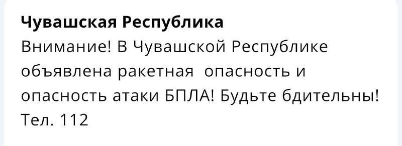 В Чувашской Республике объявлена ракетная опасность и опасность атаки БПЛА! 🔴Подписаться|Предложить новость