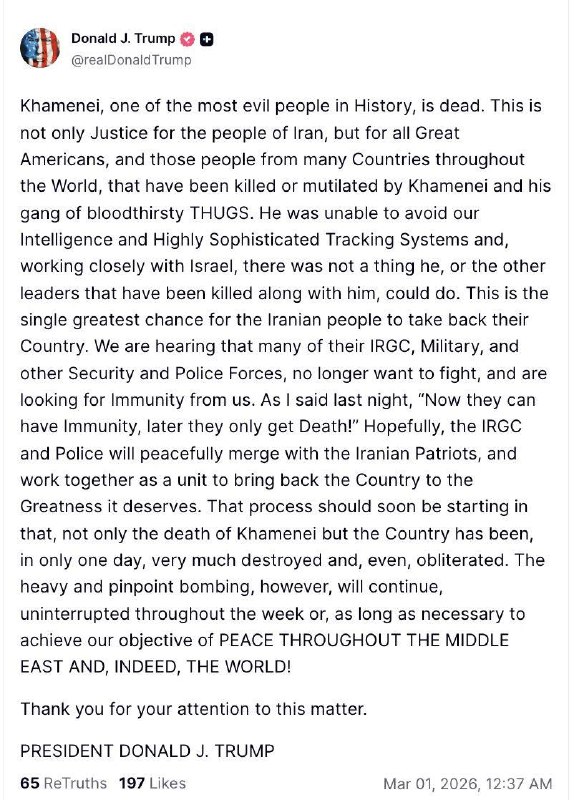 Дональд Трамп сообщил, что верховный лидер Ирана Али Хаменеи мертв. "Он не смог ускользнуть от нашей разведки и высокотехнологичных систем слежения. Ни он, ни другие лидеры, погибшие вместе с ним, н