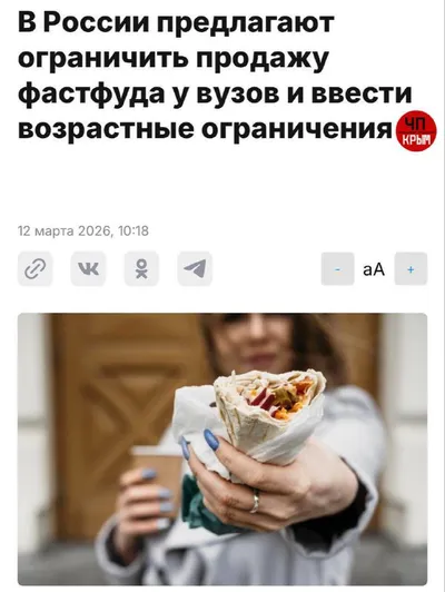 🍔Фастфуд запретят продавать россиянам младше 21 года Эксперты предлагают ввести возрастной запрет на продажу бургеров и шаурмы, а также ужесточить контроль за точками фастфуда — в частности, убрать