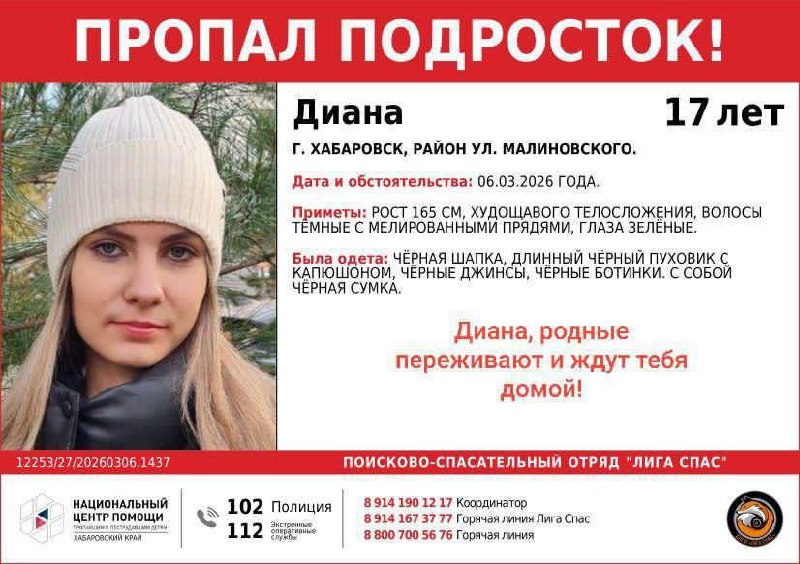 ПРОПАЛ ПОДРОСТОК! Диана, 17 лет. г. Хабаровск, район ул. Малиновского. 🦊 Дата и обстоятельства: 06.03.2026 года. 🦊 Приметы: рост 165 см, худощавого телосложения, тёмные волосы с мелированными пряд