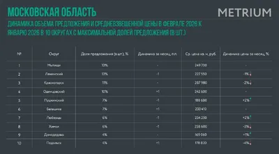 💸 Средняя стоимость кв. м в новостройках Московской области составила 228 тыс. рублей в феврале За год ценник в сделках вырос на 16%, по данным «Метриум». Средний бюджет покупки — 10,9 млн рублей (+