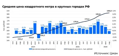 💸 За I квартал 2026 новостройки в РФ подорожали в среднем на 2,8%, подсчитали в «Циане» В условиях низкого спроса девелоперам стало сложнее индексировать цены — таких низких темпов не было с лета 20