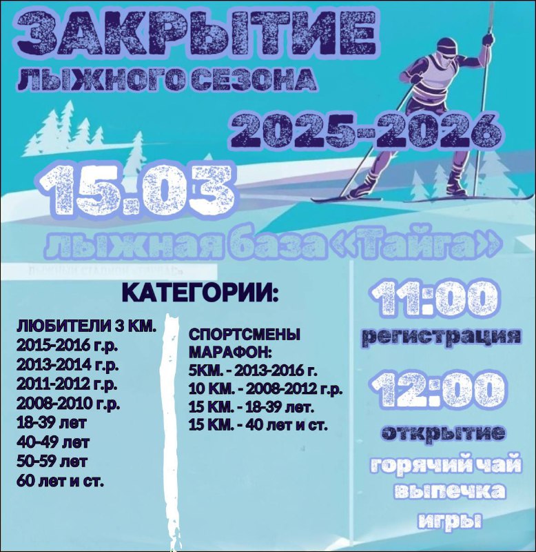 Закрытие лыжного сезона 2025–2026 📍Лыжная база «Тайга» ‼️‼️ВНИМАНИЕ ДАТА ИЗМЕНИЛАСЬ 🗓️Дата: 15 марта 🕚 Время: • Регистрация: 11:00 • Открытие: 12:00 🌟 Приглашаем всех любителей зимних видов