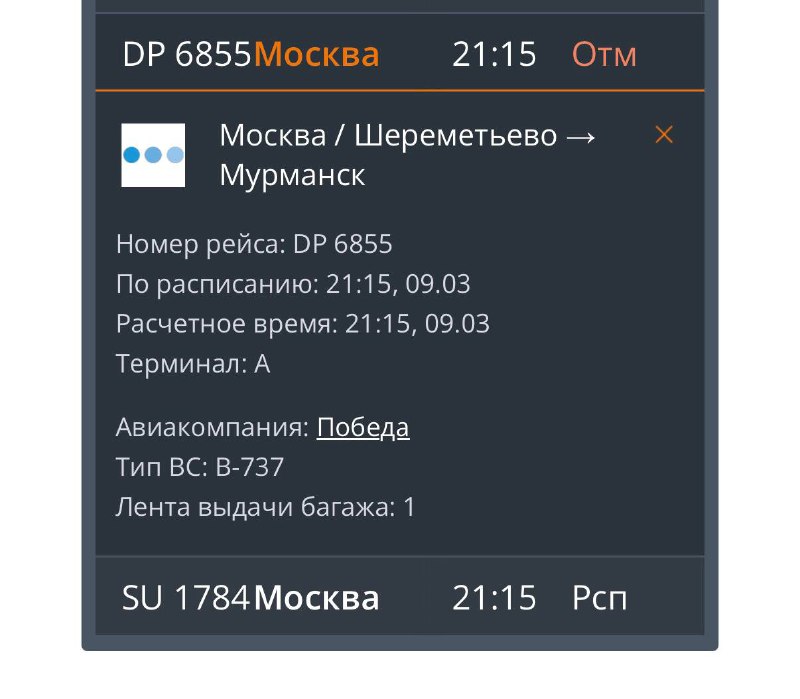 ✈️ Сегодняшний вечерний рейс «Победы» в Мурманск отменили Сегодня в Мурманск не прилетит вечерний рейс авиакомпании «Победа» из Москвы. Самолёт должен был приземлиться в 21:50. Из-за этого отменён и