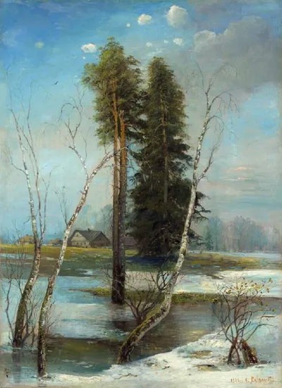 Ендогуров Иван Иванович (1861-1898) «Начало весны» (1885) Этюд к картине «Начало весны» (Русский музей, Санкт-Петербург) Холст, масло. 36,9 x 57,3 см Государственная Третьяковская галерея, (Москва)