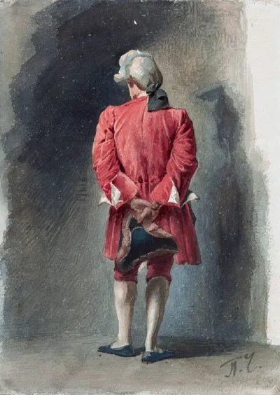 Чистяков Павел Петрович (1832 - 1919) «Мужская фигура со спины», (1865) Бумага, акварель 28,9 x 20,9 см Государственная Третьяковская галерея, (Москва) Акварельный этюд, созданный в римский период,