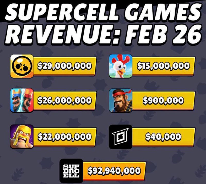 🎙 Доходы игр Supercell за февраль 2026 🔽 Clash Royale — $26M 🟰 Clash of Clans — $22M 🔼 Brawl Stars — $29M 🟰 Hay Day — $15M 🟰 Boom Beach — $900K ⚰️ MoCo — $40K 📈 Положительная динамика в доход