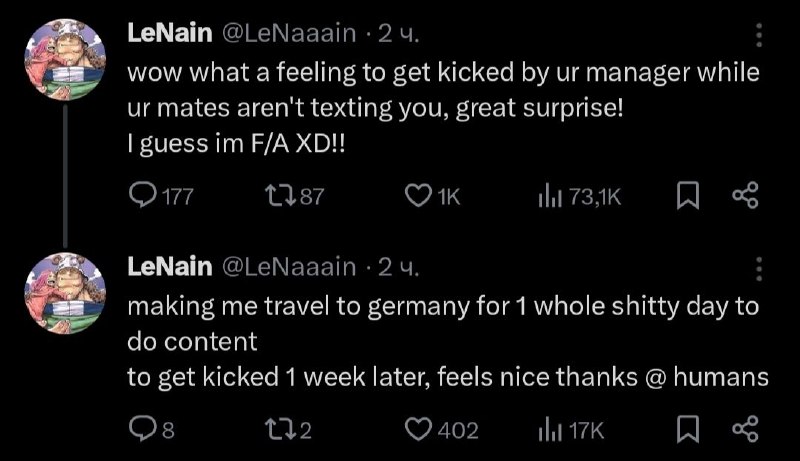 🎙 Распад NaVi 👤 Игрок LeNain сообщил, что его кикнули из команды его собственные тиммейты и теперь от снова F/A игрок. 🏆 Не прошло даже месяца, а организации уже нужно искать замену...