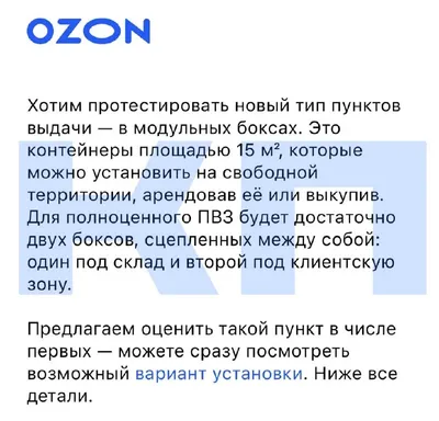 Ozon предложил партнёрам открывать пункты выдачи в контейнерах Маркетплейс хочет протестировать новый формат пунктов выдачи — в модульных боксах. Это контейнеры площадью 15 м2, которые можно установи