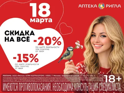 Только 18 марта, скидка до 20% в аптеках Ригла в Мурманске и в Мурманской области! При покупке от 1200 руб.! Найдите ближайшую аптеку по ссылке: https://murmansk.rigla.ru/pharmacies Ждём Вас в наших