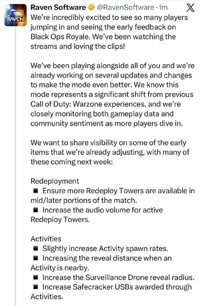 Ещё много изменений в Black Ops Royale Они уже работают над этими изменениями и многие из них выпустят уже на следующей неделе: – Больше башен для возрождения в середине/конце матча – Громче звук а