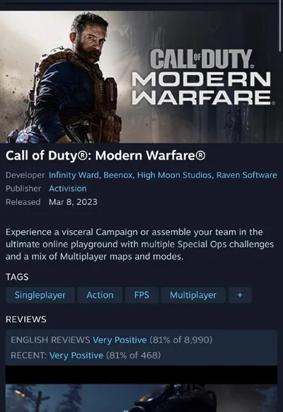 Modern Warfare небывало дешево оценена в Steam За игру просят всего 6 баксов, в других сторах такого нет. Более того таких скидок на колду вообще не бывает, так что происходит историческая хуйня. |