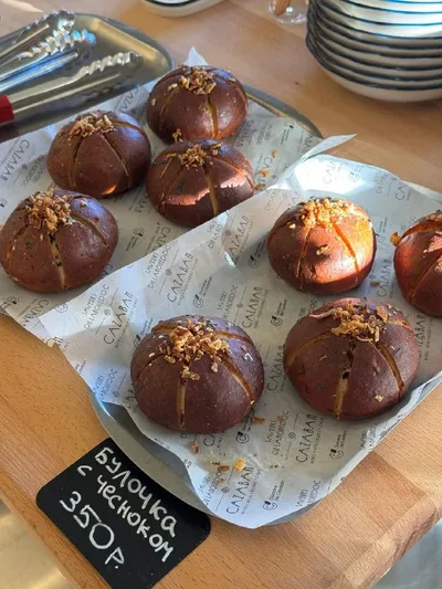 Прямое включение из Cazaban, куда зашли выпить кофе. Шли за слойкой с томатом, но ее не было, зато было булочка с чесноком… Можно подумать, что это какая-то пампушка к борщу, а на деле оказалась брио