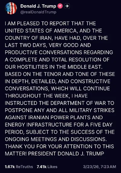 ‼️ TACO: Трамп отменил ультиматум Ирану Дональд заявил о продуктивных переговорах с Ираном о завершении войны, удары по иранским электростанциям отложены на 5 дней. По версии Ирана, Трамп просто дал