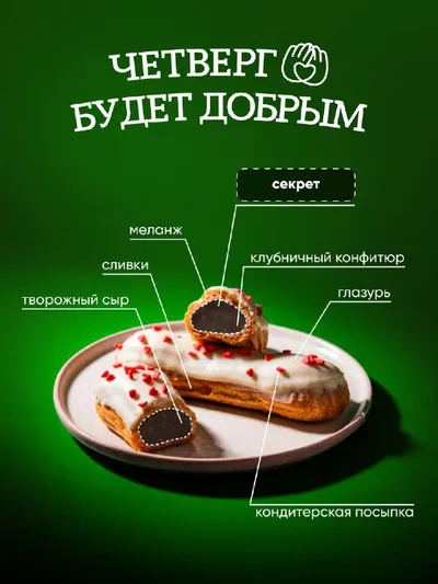 Раскрыли тайну эклера 👀 Может, это трубочки из заварного теста, крем на сливочном масле и сливках, глазурь из настоящего шоколада? Всё это честно указано в составе. Коллекция вкусов? Её можно посм