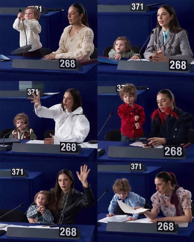 Какие восхитительные референсы выбрала Даша Золотухина, HRD Яндекса, к своей съёмке с сыном: это кадры с итальянским политиком Личией Ронцулли, которая приходила на заседания Европарламента со своей д