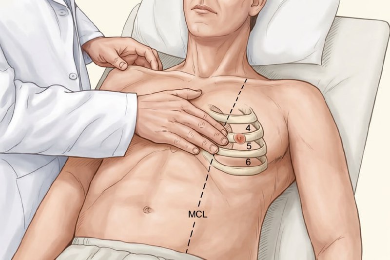 Смещение верхушечного толчка (displaced apex beat) Описание В норме верхушечный толчок пальпируется в V межрёберном промежутке слева по среднеключичной линии. О «смещённом» верхушечном толчке говор