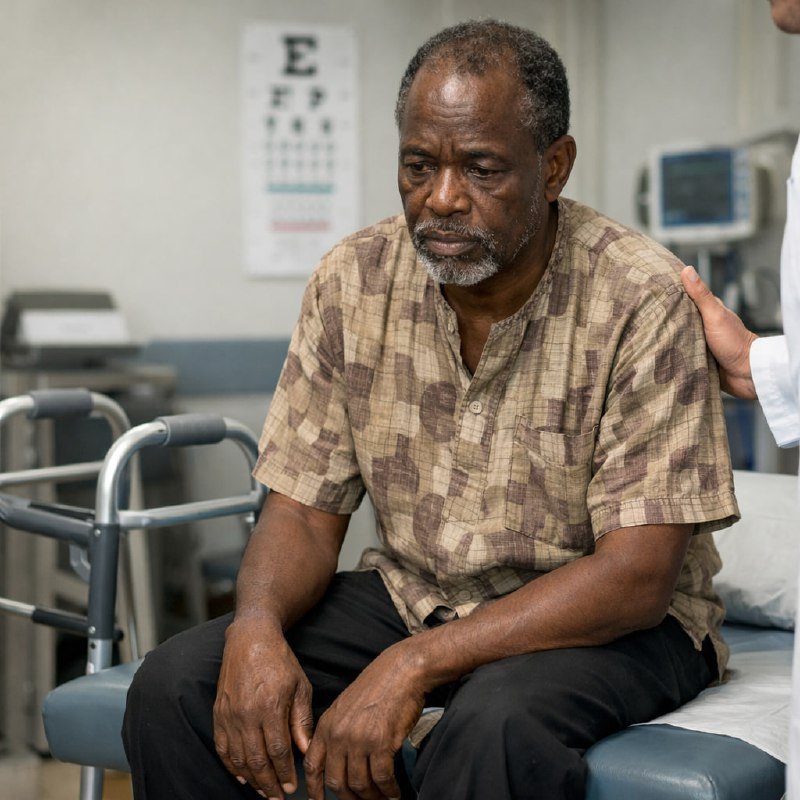 62-летний мужчина приходит на приём с дочерью из-за 3 месяцев прогрессирующей неустойчивости и трудностей при ходьбе. Пациент недавно прибыл в США, чтобы навестить дочь. Несколько раз он терял равнове