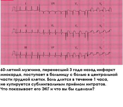 НА ЭКГ: - синусовый ритм, ЧСС 103 в минуту - нормальная ось сердца - зубцы Q в отведениях II, III, VF - нормальные комплексы QRS в передних отведениях - подъем сегмента ST в отведениях V1-V6 КЛИНИЧЕС