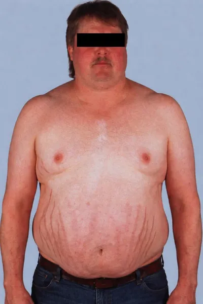 Телосложение при синдроме Кушинга 🔹 Центральное ожирение Прогрессирующее ожирение с преимущественным отложением жира в области лица, шеи, груди и живота. Поражаются также внутренние структуры и орга