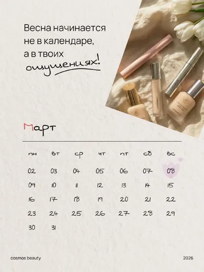 Где наша главная красотка? Это мы о тебе! С 8️⃣ марта! Желаем, чтобы радость была такой же стойкой, как макияж под пудрой Cosmos Beauty. А грусть исчезала так же быстро, как наша термотушь под теплой