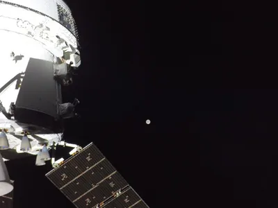 Кадр какой-то совсем фантастический: корабль «Орион» и Луна, перекрывающая Солнце. Яркая точка рядом с краем корабля — Венера.