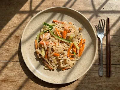 Рисовая лапша с креветками и овощами 🖤время: 25 мин 🖤КБЖУ на порцию: 380 | 22 | 12 | 45 Ингредиенты: 🖤рисовая лапша ~ 200 г 🖤креветки (очищенные) ~ 250 г 🖤перец болгарский ~ 1 шт 🖤морковь ~ 1