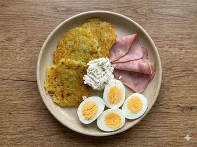 💝 Драники с ветчиной, творожным сыром и яйцом 💝 время: 35 мин 💝 КБЖУ на порцию: 320/16/18/28 Ингредиенты: 🎞️ картофель ~ 500 г 🎞️ ветчина из индейки ~ 100 г (слайсами) 🎞️ творожный сыр с зеле