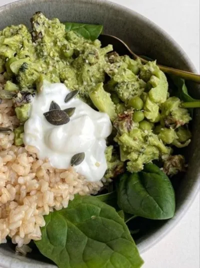 🥒 Сбалансированный ПП - боул ➡️ время: 30 мин КБЖУ на 100 г : 116 | 3 | 6 | 12 Ингредиенты: Углеводы: 🔽коричневый рис ~ 120 г Белки и овощи: 🔽зеленый с