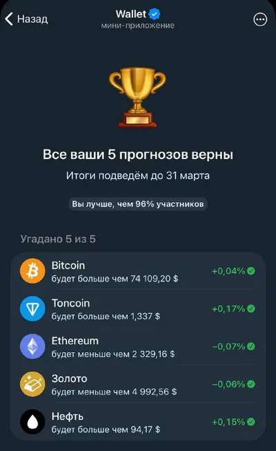 Если кто не знает то в телеграммовском @wallet очередная лудка, на этот раз бинарные опционы воплоти. Надо угадать 5 исходов. Если получится будете участвовать в каком то розыгрыше, все как обычно. Х