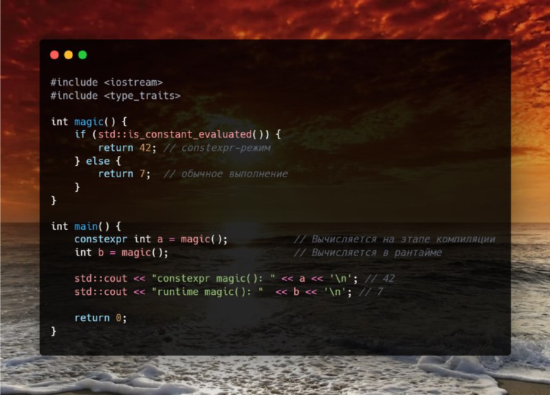⚙️ std::is_constant_evaluated() std::is_constant_evaluated() (C++20) позволяет определить, выполняется ли код в рамках constexpr-вычисления. Это полезно для написания функций, ведущих себя по-разному