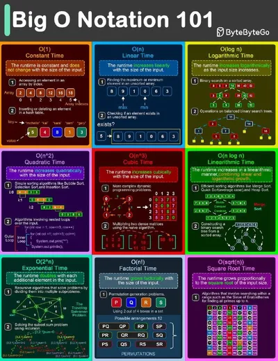 📂 Напоминалка для работы с Big O Notation! Например, O(1) — выполняется за постоянное время, а O(n) растёт линейно от размера входных данных. На картинке — основные виды сложности, которые чаще все