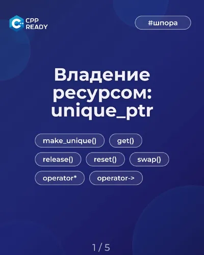 👩💻 Разберём unique_ptr — умный указатель для безопасного и автоматического управления ресурсами! С ним можно легко создавать объекты на куче, работать с сырыми указателями без передачи владения, о