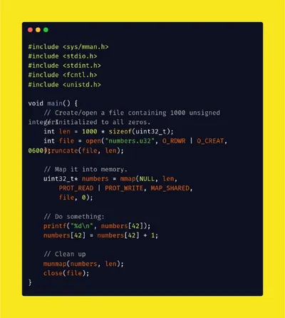 mmap() — одна из самых недооценённых возможностей в C. Если формат файла находится под вашим контролем, его можно отобразить в память и использовать напрямую как структурированные данные. Без лишней