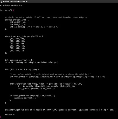 Сделал классификатор decision tree на C. Использует простые правила (height > 150cm и weight > 40kg = adult) для предсказания: ребёнок или взрослый. 👉 @Cpportal